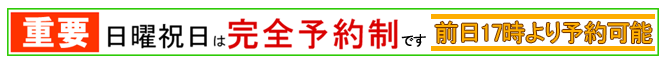 ★ 日・祝日の受付について 予約のある方のみの診察を行います。 【予約方法】 午前枠の予約受付 前日17:00 〜 当日11:15まで 午後枠の予約受付 当日08:30 〜 16:15まで ※インターネット、予約専用電話がご利用可能です。 ※予約枠が満杯になった時点で受け付け終了です。